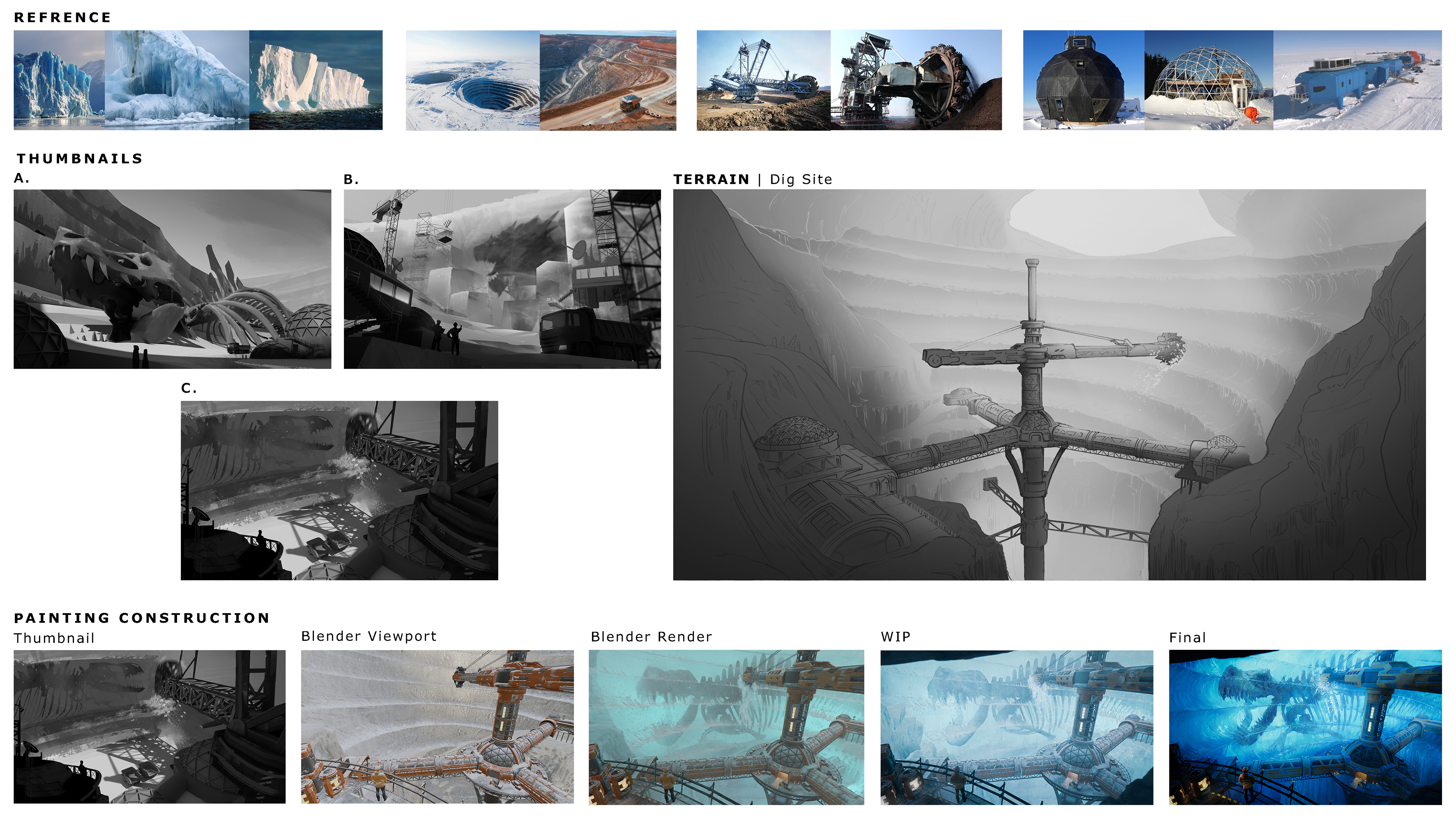 For this piece I was inspired by artic research stations and Artic Biodomes. These structures look very Interesting due to the harsh environment, however its not very obvious what goes on in them. So I thought it be interesting to do a sci-fi twist having an excavation on site.